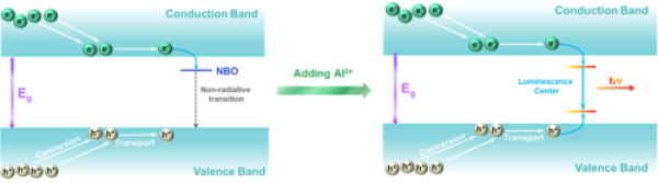 研究團(tuán)隊(duì)利用分相法和燒結(jié)法,制備了Mn2+/Al3+、Eu2+/Mn2+共摻以及Eu2+/Mn2+/Al3+三摻的高硅氧玻璃,測(cè)試發(fā)現(xiàn)Al3+起到以下作用:一是通過物理集群分散效應(yīng),緩解Mn2+的團(tuán)聚程度,從而提高稀土離子的發(fā)光效率;二是拓寬了Mn2+的激發(fā)光譜,并導(dǎo)致熒光中心紅移,有潛力成為照明、顯示和其他應(yīng)用的高效WLED玻璃;三是對(duì)Al3+作用有了新認(rèn)識(shí),即Al3+以[AlO4/2]-1四面體的形式減少了NBO的相對(duì)數(shù)量,可以有效提高光致發(fā)光和輻射發(fā)光效率。玻璃中的NBO是高能輻射引起的電子空穴的復(fù)合中心,是決定輻射發(fā)光效率的關(guān)鍵因素。在此基礎(chǔ)上,研究人員完善了氧化物玻璃中輻射發(fā)光光子數(shù)的計(jì)算公式。玻璃的簡單組成和特殊結(jié)構(gòu)有利于研究各種活性離子對(duì)發(fā)光的影響,而高硅氧玻璃正是探索各種發(fā)光活性離子行為的優(yōu)良基質(zhì)材料。
