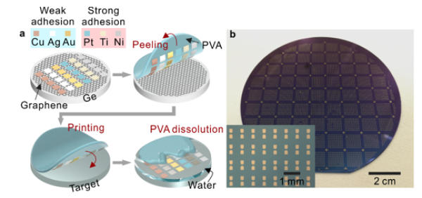 圖1.a、石墨烯輔助金屬轉(zhuǎn)印技術(shù)流程;b、4英寸金電極轉(zhuǎn)印陣列照片