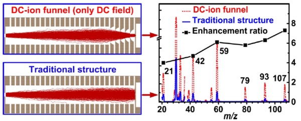 質(zhì)子轉(zhuǎn)移反應(yīng)質(zhì)譜(PTR-MS)技術(shù)在環(huán)境監(jiān)測(cè)、醫(yī)學(xué)研究、公共安全和食品科學(xué)等領(lǐng)域都有著重要的應(yīng)用價(jià)值。該研究團(tuán)隊(duì)一直致力于PTR-MS技術(shù)研究和儀器研制,通過(guò)十余年時(shí)間實(shí)現(xiàn)了PTR-MS儀器產(chǎn)品化。前期研制的PTR-MS儀器在具有高靈敏的同時(shí),還有大功率和大體積的不足。針對(duì)大氣揮發(fā)性有機(jī)物(VOCs)車載監(jiān)測(cè)需求,如何在減小體積和功率的情況下保證較高的靈敏度是車載小型化PTR-MS發(fā)展的難題。國(guó)外研究人員為了提高靈敏度,一般在PTR-MS中采用射頻場(chǎng)離子漏斗來(lái)聚焦離子,但射頻場(chǎng)需要射頻電源,這會(huì)增加功率和體積,不適用于車載小型化PTR-MS。