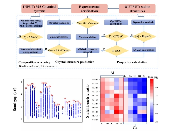 近日,中國(guó)科學(xué)院新疆理化技術(shù)研究所光電功能晶體材料團(tuán)隊(duì)報(bào)道了一種適用于非線性光學(xué)晶體材料的研究新范式。這種新研究范式將機(jī)器學(xué)習(xí)、晶體結(jié)構(gòu)預(yù)測(cè)、高通量計(jì)算與篩選及實(shí)驗(yàn)探索融為一體,實(shí)現(xiàn)了非線性光學(xué)晶體材料從理論預(yù)測(cè)到實(shí)驗(yàn)合成的重大跨越。研究通過(guò)機(jī)器學(xué)習(xí)利用原子卷積神經(jīng)網(wǎng)絡(luò)(ATCNN)算法對(duì)3887個(gè)化學(xué)組分進(jìn)行帶隙預(yù)測(cè),數(shù)據(jù)清洗之后,將研究體系鎖定在AIBIIISe2(AI = Li, Na, K, Rb, Cs;BIII = Al, Ga);在隨后對(duì)其進(jìn)行晶體結(jié)構(gòu)預(yù)測(cè)的工作中,預(yù)測(cè)了所有已知的結(jié)構(gòu),同時(shí)發(fā)現(xiàn)了5個(gè)熱力學(xué)穩(wěn)定和50個(gè)熱力學(xué)亞穩(wěn)態(tài)新的三元硒化物;高通量的計(jì)算和篩選結(jié)果表明,8例結(jié)構(gòu)可實(shí)現(xiàn)帶隙和倍頻之間的平衡(Eg > 2.70 eV, |dij| > 10 pm/V),2例已通過(guò)實(shí)驗(yàn)成功合成,其中1例結(jié)構(gòu)顯示出大的倍頻效應(yīng)(≈2 × AGS)和寬的透過(guò)范圍,可覆蓋兩個(gè)重要的大氣波段(3-5、8-12 μm)。該研究體現(xiàn)了從理論預(yù)測(cè)到實(shí)驗(yàn)驗(yàn)證的成功案例,并為后續(xù)新型非線性光學(xué)晶體材料的設(shè)計(jì)及合成提供了有效策略。