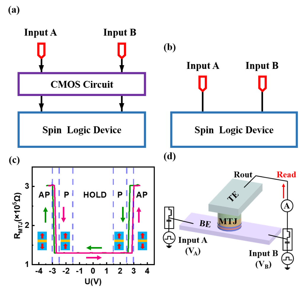 圖1、(a)雙極性自邏輯器件電路結構,(b)單極性自旋邏輯器件電路結構,(c)單極性器件翻轉特性曲線,(d)測試電路圖。