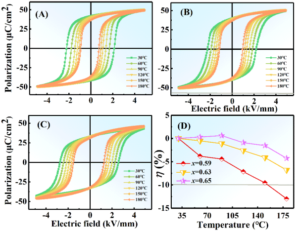 不同相結(jié)構(gòu)的鐵電性溫度穩(wěn)定性:(A)三方相 x = 0.59,(B)MPB x = 0.63,(C)四方相 x = 0.65