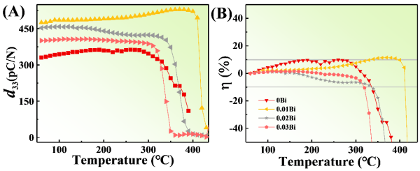 BS-BPZnT陶瓷的(A)原位d33和(B)原位d33的變化率隨溫度的變化