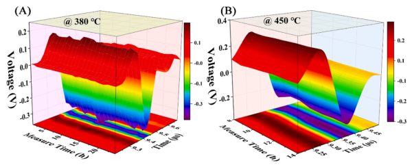 高溫?fù)Q能器在高溫下的不同保溫時間脈沖回波圖:(A)380℃,(B)450℃