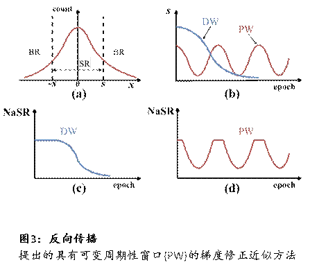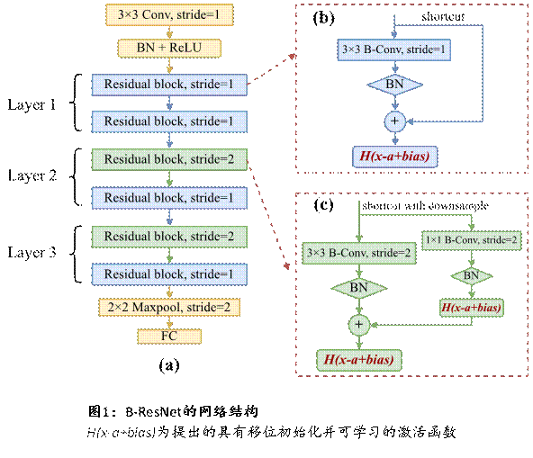 針對上述問題,感知中心科研團(tuán)隊(duì)提出了一種用于語音喚醒的極輕量化、高準(zhǔn)確率的改進(jìn)二值殘差神經(jīng)網(wǎng)絡(luò)B-ResNet(Binary Residual Neural Network,圖1),利用二值量化方法,將神經(jīng)網(wǎng)絡(luò)中的全精度權(quán)重、激活參數(shù)量化為1bit(+1,-1),顯著降低內(nèi)存占用,亦可將網(wǎng)絡(luò)中存在的大量浮點(diǎn)卷積乘加運(yùn)算簡化為XNOR同或邏輯與popcount運(yùn)算,大幅降低計(jì)算復(fù)雜度。為解決二值網(wǎng)絡(luò)帶來的精度下降問題,團(tuán)隊(duì)在B-ResNet網(wǎng)絡(luò)前向傳播中提出了一種具有移位初始化且可學(xué)習(xí)的激活函數(shù)來優(yōu)化網(wǎng)絡(luò)各層激活值分布,降低信息損失(圖2),并在反向傳播過程中,提出了一種具有可變周期性窗口的梯度修正近似方法,有效解決了梯度失配與消失問題(圖3)。在GSCD(Google Speech Commands Dataset)標(biāo)準(zhǔn)語音數(shù)據(jù)集的12分類任務(wù)下,與基線網(wǎng)絡(luò)Res8-narrow相比,該技術(shù)可降低33%參數(shù)量與72%計(jì)算量,實(shí)現(xiàn)更高的語音喚醒精度,為后續(xù)該功能的低功耗硬件實(shí)現(xiàn)奠定了良好基礎(chǔ)。