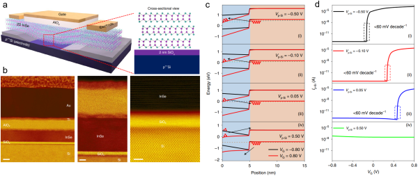 (a)二維/三維范德華異質結器件結構,(b)異質結器件的透射電鏡截面圖,(c)局域場調控下的二維/三維范德華異質結能帶,(d)器件的輸出特性曲線。