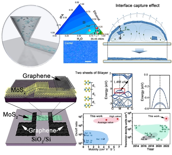 近日,化學(xué)所與清華大學(xué)、美國加州大學(xué)合作,提出了一種界面捕獲效應(yīng)打印策略。該策略使用低沸點水性超分散二維材料油墨,直寫打印二維半導(dǎo)體薄膜陣列,無需添加額外表面活性劑。具體而言,這一策略通過對剝離的半導(dǎo)體2H-MoS2納米片進(jìn)行分級離心,獲得了主要為雙層厚度的窄分布納米片;通過建立表面張力和組分比的三溶劑相圖,確定了合適的油墨溶劑。印刷超薄圖案(約3nm厚度)主要以單層或兩層的MoS2納米片連續(xù)均勻排列,并抑制了咖啡環(huán),空隙率較低(約4.9%)。研究使用商用石墨烯作為電極,制備的晶體管在室溫下顯示出6.7 cm2·V-1·s-1的遷移率和2×106的開關(guān)比,超過了此前印刷MoS2薄膜晶體管的性能。基于此,科研人員制備了高密度(約47000個/cm2)印刷晶體管陣列。該界面捕獲效應(yīng)打印策略可應(yīng)用于其他2D材料,包括NbSe2、Bi2Se3和黑磷,為印刷二維材料電子器件提供了新方法和新思路。