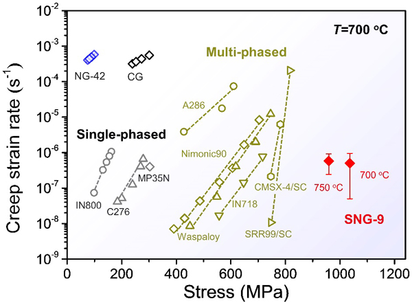 圖2.具有弛豫晶界的納米晶MP35N合金的蠕變性能,及其與其它牌號高溫合金性能對比