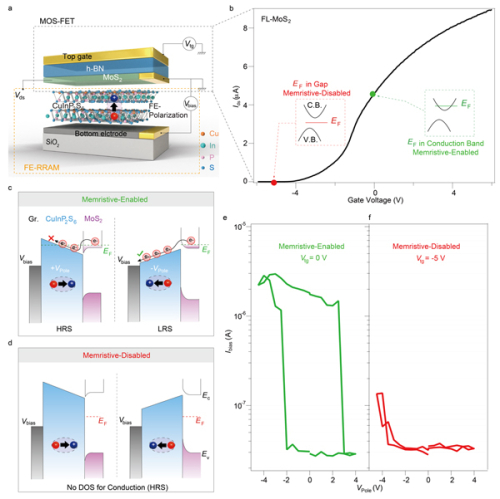 圖3.器件的可編程存儲特性。a、器件結構示意圖;b、MoS2層的轉移特性曲線;c-d、異質結的能帶結構圖;e-f、通過施加門電壓實現了對存儲窗口從有到無的調控。