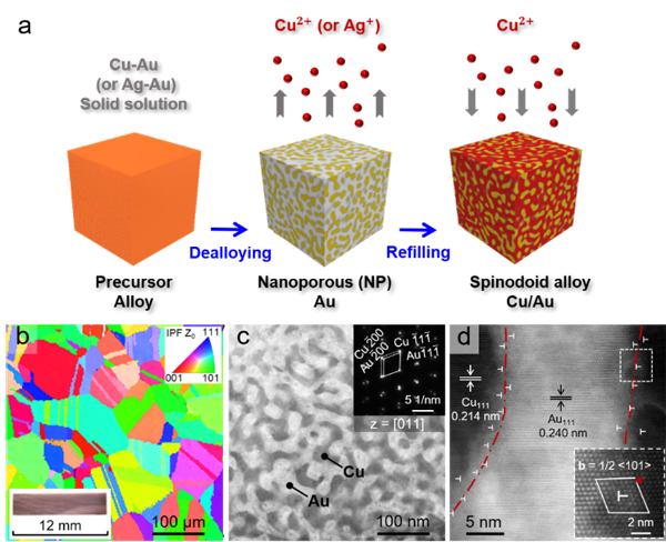圖1.仿調(diào)幅分解結(jié)構(gòu)Cu/Au合金的制備及結(jié)構(gòu)特征。(a)脫合金與電沉積結(jié)合形成仿調(diào)幅分解結(jié)構(gòu)的示意圖;(b)EBSD照片顯示該材料粗大的晶粒尺寸,(c)TEM照片顯示其雙連續(xù)納米雙相結(jié)構(gòu),(d)HRTEM照片顯示半共格界面和高密度失配位錯(cuò)。