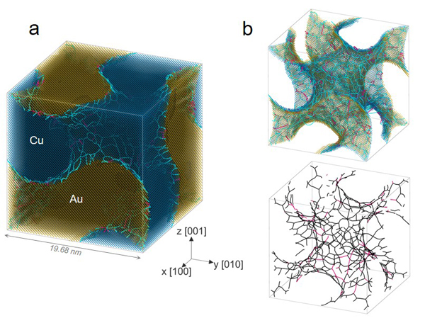 圖2.仿調(diào)幅分解結(jié)構(gòu)Cu/Au合金的分子動(dòng)力學(xué)模擬。(a)典型Gyroid雙相結(jié)構(gòu)及其光滑連續(xù)半共格界面,(b)界面上大量失配位錯(cuò)組成的三維位錯(cuò)網(wǎng)絡(luò)。