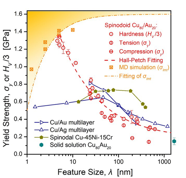 圖3.仿調(diào)幅分解結(jié)構(gòu)Cu/Au合金屈服強(qiáng)度的特征結(jié)構(gòu)尺寸效應(yīng),其強(qiáng)度隨結(jié)構(gòu)尺寸減小而持續(xù)上升,并逼近理論計(jì)算的理論強(qiáng)度。