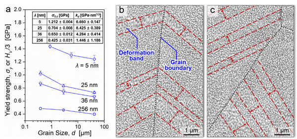 )高幾個(gè)數(shù)量級,其強(qiáng)度仍表現(xiàn)出顯著的晶粒尺寸(d)效應(yīng)。(b-c)SEM照片顯示晶界對剪切帶有明顯的阻礙作用,與強(qiáng)度的晶粒尺寸效應(yīng)相一致。