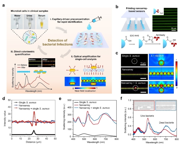 近日,該課題組將一維納米結(jié)構(gòu)的光學(xué)信號放大作用與蒸發(fā)過程中毛細力驅(qū)動的顆粒預(yù)富集相結(jié)合,設(shè)計出快速超靈敏的微生物檢測芯片。研究以聚苯乙烯微球懸浮液為墨水,在基底上印刷制備了大面積的一維納米光子結(jié)構(gòu),并利用聚苯乙烯微球表面大量的羧基高效偶聯(lián)抗體,特異性地識別待檢測樣本中的致病菌。研究發(fā)現(xiàn),將毛細力誘導(dǎo)的咖啡環(huán)效應(yīng)引入微生物檢測,可在基底上對目標(biāo)病原體進行預(yù)富集,提高檢測效率。除了捕獲細菌,納米光子結(jié)構(gòu)還具有強的光場局域能力,可顯著增強細菌的散射光信號,提高檢測靈敏度,能夠在單細胞水平上對其物理特征如生理環(huán)境、活性、繁殖狀態(tài)進行可視化分析。進一步,研究實現(xiàn)了連續(xù)監(jiān)測水、血清、尿液以及蔬菜等樣本中的細菌情況。這種生物檢測芯片制備簡單、成本低,能夠結(jié)合普通的商業(yè)顯微鏡或者手機直接獲取檢測結(jié)果,在醫(yī)療診斷、食品安全、環(huán)境監(jiān)測和農(nóng)業(yè)等領(lǐng)域具有廣闊的應(yīng)用前景。