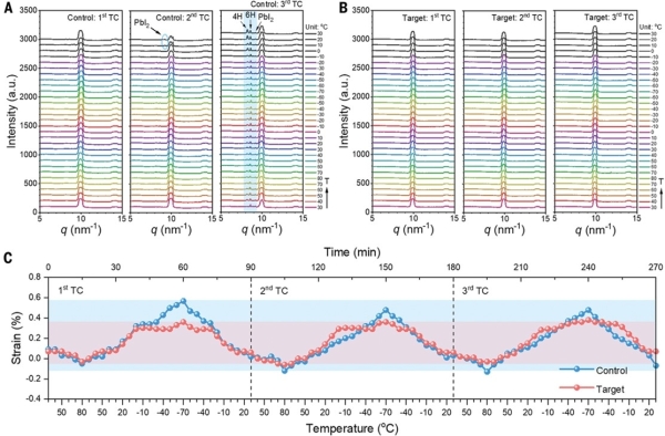 近日,德國亥姆霍茲柏林材料與能源研究中心、中國科學院上海高等研究院上海光源科學中心衍射線站、河南大學材料學院合作,發(fā)表了鈣鈦礦光伏領域取得的最新進展。相關研究成果以《耐受溫度變化的高效p-i-n鈣鈦礦太陽能電池》(Highly efficient p-i-n perovskite solar cells that endure temperature variations)為題,發(fā)表在《科學》(Science)上。該研究使用上海光源BL14B線站同步輻射衍射原位表征技術。這一技術為該工作提供了關鍵數(shù)據(jù)。