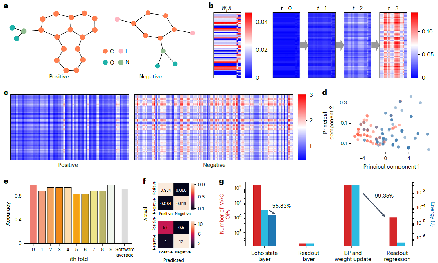 針對(duì)上述問題,微電子所微電子器件與集成技術(shù)重點(diǎn)實(shí)驗(yàn)室劉明院士團(tuán)隊(duì)尚大山研究員與香港大學(xué)電子工程系王中銳博士合作,開發(fā)了一種利用儲(chǔ)池計(jì)算(Reservoir Computing)技術(shù)實(shí)現(xiàn)圖結(jié)構(gòu)化數(shù)據(jù)分類的技術(shù)——回聲狀態(tài)圖網(wǎng)絡(luò)(ESGNN)。儲(chǔ)池計(jì)算是循環(huán)神經(jīng)網(wǎng)絡(luò)的一種簡(jiǎn)化形式,能夠?qū)r(shí)序輸入信號(hào)通過神經(jīng)元的非線性激活函數(shù)轉(zhuǎn)換到一個(gè)高維空間中,再通過一個(gè)簡(jiǎn)單線性回歸方法有效地讀出。儲(chǔ)池計(jì)算中循環(huán)連接層的權(quán)重始終固定不變,只需訓(xùn)練輸出層權(quán)重,可最大限度降低訓(xùn)練復(fù)雜度和訓(xùn)練時(shí)間。在硬件方面,團(tuán)隊(duì)利用RRAM的本征隨機(jī)性構(gòu)建大規(guī)模隨機(jī)電阻陣列(圖1a-b),將其作為儲(chǔ)池網(wǎng)絡(luò)的初始化權(quán)重,具有低成本、可擴(kuò)展優(yōu)勢(shì)。在軟件方面,ESGNN巧妙運(yùn)用了隨機(jī)電阻陣列帶來(lái)的物理隨機(jī)投影,以存內(nèi)計(jì)算的方式完成圖嵌入過程,大大降低了圖神經(jīng)網(wǎng)絡(luò)的訓(xùn)練成本。團(tuán)隊(duì)還通過軟—硬協(xié)同優(yōu)化技術(shù),在基于FPGA的板級(jí)測(cè)試平臺(tái)上實(shí)現(xiàn)了對(duì)MUTAG、COLLAB數(shù)據(jù)集的圖分類,進(jìn)行了更大規(guī)模CORA數(shù)據(jù)集的節(jié)點(diǎn)分類仿真。相比傳統(tǒng)數(shù)字硬件系統(tǒng),能效分別提升了2.16、35.42和40.37倍。該工作展現(xiàn)了RRAM陣列在構(gòu)建邊緣圖學(xué)習(xí)系統(tǒng)方面的巨大潛力,也為利用自然界豐富的物理、化學(xué)性質(zhì)開發(fā)更高效的智能硬件系統(tǒng)提供了參考。