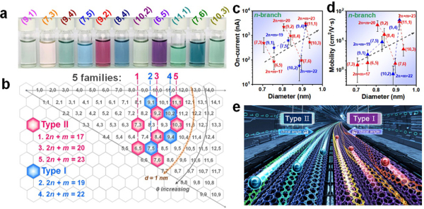 碳納米管薄膜電學(xué)輸運(yùn)性能與手性結(jié)構(gòu)的關(guān)系。(a)所用碳納米管溶液照片;(b)所用碳納米管手性結(jié)構(gòu)分布;(c-d)不同手性碳納米管薄膜場(chǎng)效應(yīng)晶體管開態(tài)飽和電流和電子遷移率與直徑關(guān)系;(e)碳納米管電學(xué)性能與手性結(jié)構(gòu)的依存關(guān)系示意圖。