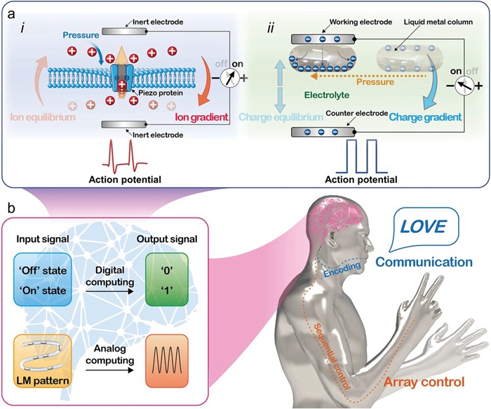 圖1 LMMD的仿生設(shè)計(jì)。a. i)壓電蛋白的壓敏行為。ii) LMMDs的仿生的狀態(tài)切換行為。b. LMMDs的集成功能及其在柔性人工智能系統(tǒng)中的應(yīng)用。