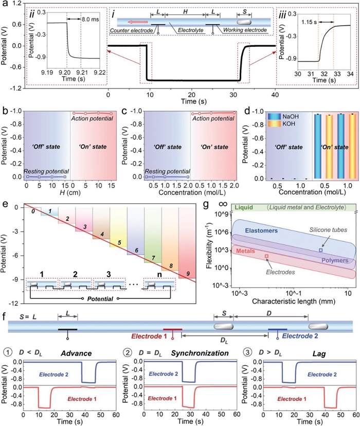 圖2 LMMD的機(jī)電特性。a. LMMD的響應(yīng)過程。i) LMMD的管道式拓?fù)浣Y(jié)構(gòu)。ii) 激活階段;iii) 恢復(fù)階段。b.液態(tài)金屬液柱與電極間距的影響。c.溶液濃度的影響。d. 溶液種類的影響。e. 器件串聯(lián)的輸出響應(yīng)。f. 輸出信號的時(shí)序控制,包括信號超前、信號同步、信號滯后。g. LMMD的各組成部分的柔性評估。