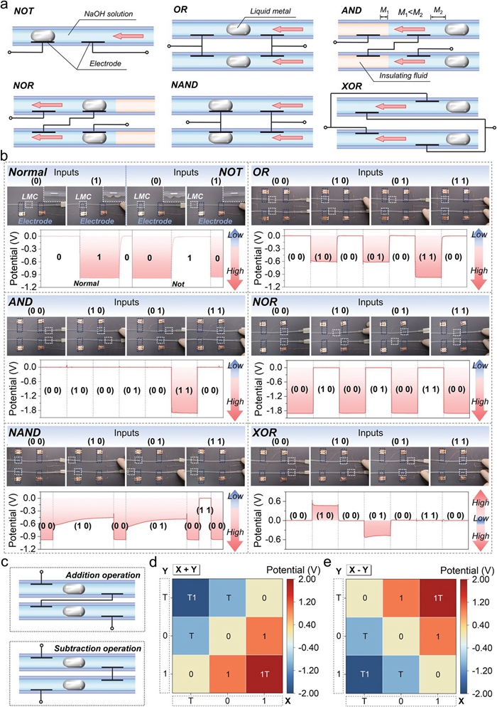 圖3 LMMD的邏輯運(yùn)算功能。a. 構(gòu)建的邏輯門的結(jié)構(gòu)原理圖。b. 邏輯門的真值表和輸出電位信號。c. 三進(jìn)制加、減運(yùn)算器的結(jié)構(gòu)原理圖。d. 加法運(yùn)算的輸出電位信號。e. 減法運(yùn)算的輸出電位信號。