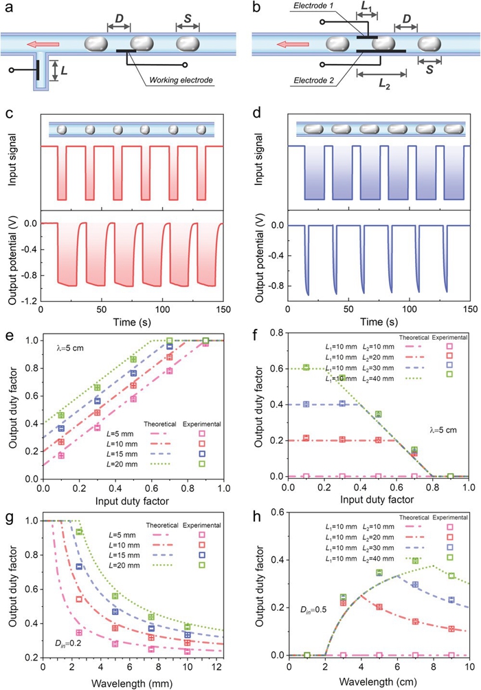 圖4 LMMD的模擬運(yùn)算功能。a. 第一種器件結(jié)構(gòu)示意圖。b. 第二種器件結(jié)構(gòu)示意圖。c. 信號放大。d. 信號濾波。e. 對于第一種器件結(jié)構(gòu),輸入占空比與輸出占空比的關(guān)系。f. 對于第二種器件結(jié)構(gòu),輸入占空比與輸出占空比的關(guān)系。g. 對于第一種器件結(jié)構(gòu),波長與輸出占空比的關(guān)系。h. 對于第二種器件結(jié)構(gòu),波長與輸出占空比的關(guān)系。