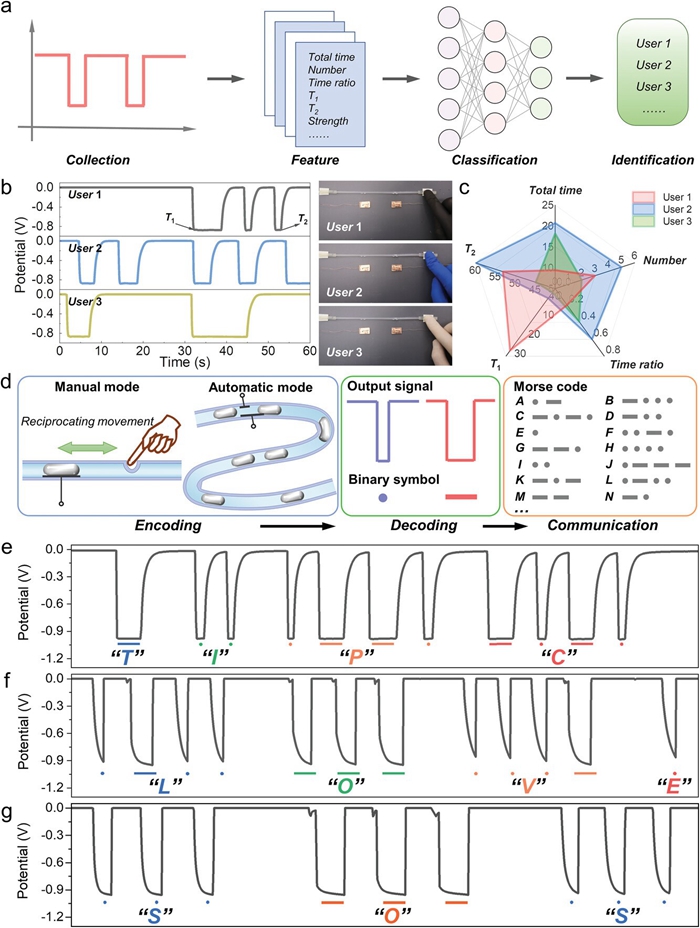 圖5 LMMD的機(jī)電交互功能。a. 算法分析輔助的信息識別功能的原理示意圖。b. 基于不同的按壓習(xí)慣的輸出信號。c. 輸出信號特征的對比五星圖。d. 信息通信和加密過程示意圖。e. 在手動(dòng)輸入模式下,利用輸出電位信號表示位置信息“TIPC”。f. 在自動(dòng)輸入模式下,利用輸出電位信號表示情感信息“LOVE”。g. 在自動(dòng)輸入模式下,利用輸出電位信號表示遇險(xiǎn)求救信號“SOS”。