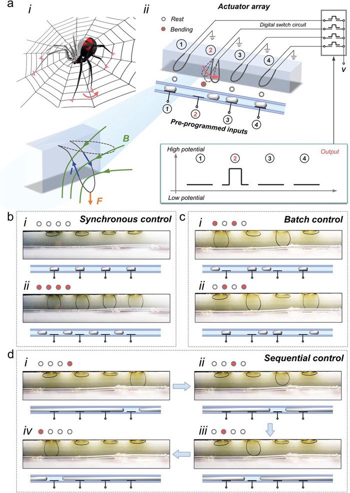 圖6 LMMD的機(jī)電控制功能。a. i) 蜘蛛對腳的陣列控制。ii) LMMD的陣列控制原理示意圖。b. 四個(gè)碳纖維致動(dòng)器同步控制。c. 四個(gè)碳纖維致動(dòng)器的批量控制。d) 四個(gè)碳纖維致動(dòng)器順序控制。