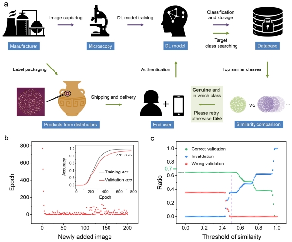 借助高通量的圖案化光刻(鏤空模板)、薄膜沉積及一步熱退火技術(shù),可實現(xiàn)晶圓級PUF單元制作,體現(xiàn)了批量化、低成本(單個標(biāo)簽成本不到1美分)的生產(chǎn)特點。為了應(yīng)用到實際防偽場景,研究人員開發(fā)了一種基于深度學(xué)習(xí)算法的圖像PUF識別驗證系統(tǒng),借助ResNet50分類神經(jīng)網(wǎng)絡(luò)模型對37000個PUF標(biāo)識符(10348)實現(xiàn)了可溯源、快速(6.36 s)、高精度(0%假陽性)驗證,并提出了動態(tài)數(shù)據(jù)庫策略,賦予深度學(xué)習(xí)模型極高的數(shù)據(jù)庫擴容能力,理論上打破了龐大數(shù)據(jù)庫的建立與低時間成本之間難以兼容的障礙。此外,這種PUF制作與微電子工藝流程高度兼容,有望與元器件同時集成并完成元件單元的真實性驗證。PUF系統(tǒng)可初步滿足工業(yè)化需求,有望推動商業(yè)化的PUF防偽技術(shù)的發(fā)展與普及。相關(guān)技術(shù)已申請國家發(fā)明專利并已獲授權(quán)。