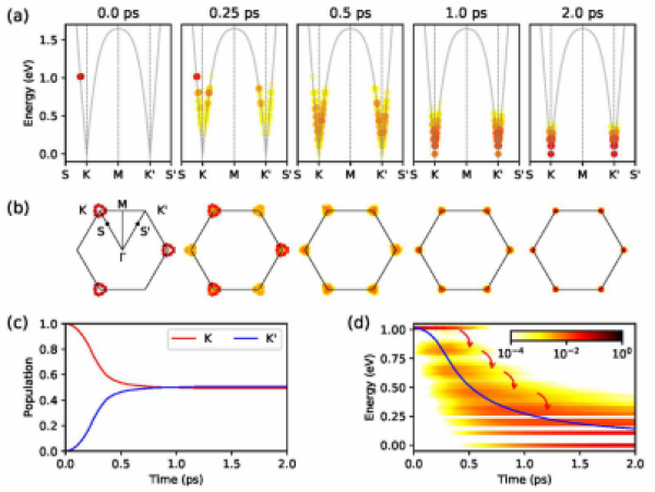 本工作利用最新發(fā)展的方法探究了石墨烯材料熱電子弛豫的動力學過程。研究發(fā)現(xiàn),石墨烯中的熱電子弛豫存在一個0.2 eV的激發(fā)閾值,當熱電子初始激發(fā)能量大于0.2 eV時,無論是熱電子能量弛豫還是K-K’的谷間散射,發(fā)生的時間尺度都在皮秒量級,此時電子耦合的是能量較高的光學支聲子;當激發(fā)能小于0.2 eV時,電子只能與較低能量的聲學支聲子耦合,能量弛豫與谷間散射的時間尺度都會加長到納秒量級。該成果為研究材料中的載流子在動量空間中的動力學行為提供了有力工具,并為研究光致相變、光催化提供了可能的技術(shù)手段。