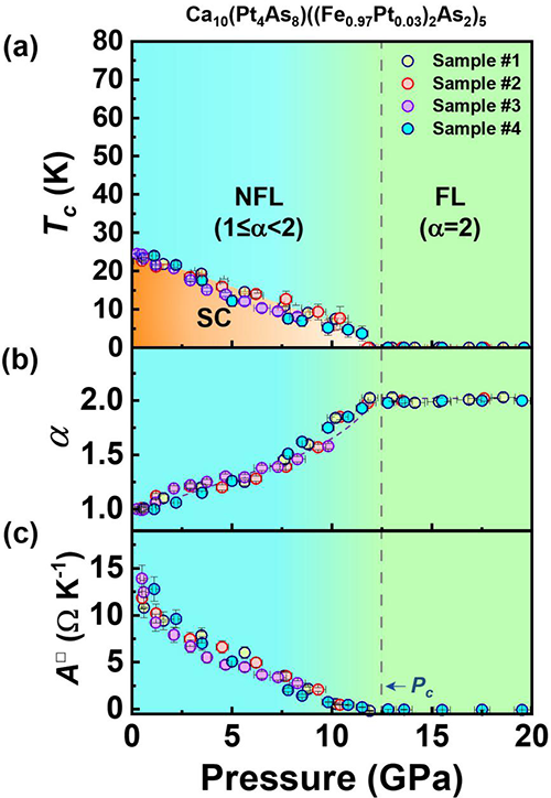 近日,中國(guó)科學(xué)院物理研究所/北京凝聚態(tài)物理國(guó)家研究中心研究員孫力玲小組與研究員邱祥岡等,聯(lián)合美國(guó)普林斯頓大學(xué)教授R. Cava、美國(guó)加利福尼亞大學(xué)洛杉磯分校教授N. Ni, 對(duì)具有奇異金屬態(tài)的鐵基超導(dǎo)體Ca10(Pt4As8)((Fe0.97Pt0.03)2As2)5(簡(jiǎn)稱為1048 超導(dǎo)體)中奇異金屬態(tài)和超導(dǎo)態(tài)的壓力響應(yīng)行為進(jìn)行了系統(tǒng)研究,發(fā)現(xiàn)了隨著壓力的增加,其超導(dǎo)轉(zhuǎn)變溫度(Tc)連續(xù)下降,同時(shí)冪指數(shù)由常壓下的 α=1 逐漸增加,而系數(shù)A隨著壓力逐漸減小。在量子相變臨界壓力處,超導(dǎo)轉(zhuǎn)變溫度Tc和A系數(shù)同時(shí)趨于零,轉(zhuǎn)變成具有非超導(dǎo)費(fèi)米液體態(tài)的高壓相。