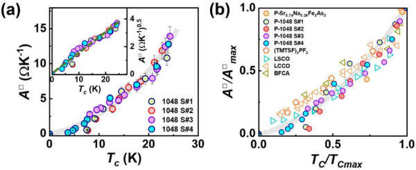 圖2. (a)壓力下1048超導(dǎo)體超導(dǎo)轉(zhuǎn)變溫度與系數(shù)A的變化關(guān)系;(b)不同的非常規(guī)超導(dǎo)體在壓力下及常壓摻雜得到Tc與A系數(shù)歸一化后的關(guān)系,包括1048超導(dǎo)體和Sr0.74Na0.26Fe2As2超導(dǎo)體以及常壓下?lián)诫s的銅氧化物超導(dǎo)體及有機(jī)超導(dǎo)體。