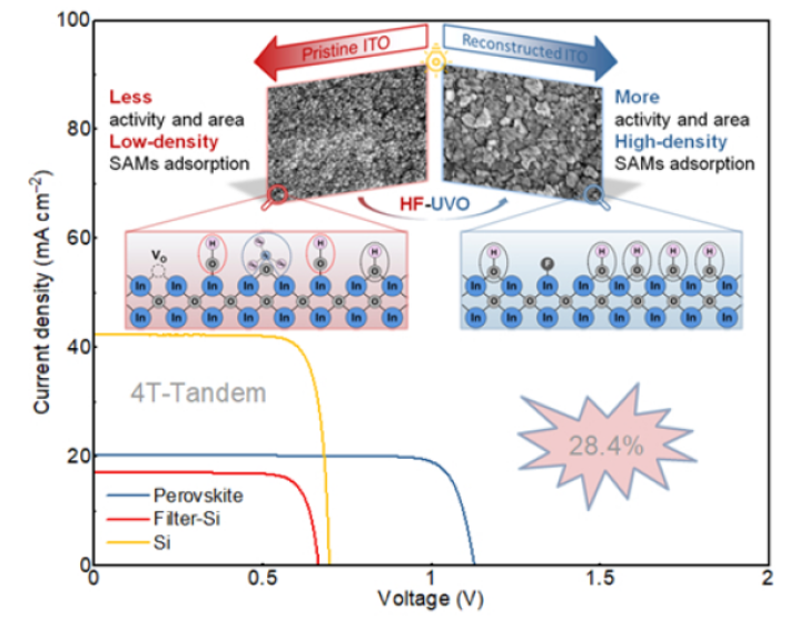基于ITO表面重構(gòu)的四端鈣鈦礦/硅疊層太陽電池的J-V曲線和ITO表面重構(gòu)前后的微觀形貌及表面化學(xué)變化圖