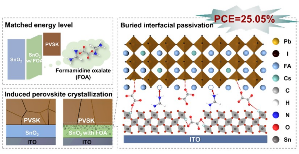 研究發(fā)現,甲脒離子和草酸根離子在SnO2層中均呈縱向梯度分布,聚集在SnO2/鈣鈦礦埋底界面處,調節(jié)鈣鈦礦的晶體生長,降低體相及界面缺陷,改善鈣鈦礦和SnO2之間的能級匹配。結果表明,FOA處理后的PSCs能量轉換效率從22.40%提高到25.05%,同時PSCs的存儲穩(wěn)定性和光穩(wěn)定性也顯著提升。