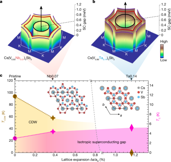 CsV3Sb5體系中穩(wěn)健的無(wú)節(jié)點(diǎn)超導(dǎo)配對(duì)。a-b、超導(dǎo)能隙在動(dòng)量空間的示意圖;c、化學(xué)摻雜的相圖。