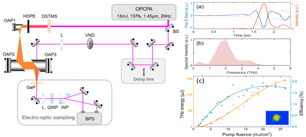 該工作基于上海光機(jī)所新一代超強(qiáng)超短脈沖激光綜合實(shí)驗(yàn)裝置,利用高能紅外激光驅(qū)動(dòng)有機(jī)晶體DSTMS發(fā)生光整流效應(yīng),通過優(yōu)化相位匹配條件,獲得單脈沖能量175μJ、峰值場(chǎng)強(qiáng)17MV/cm的強(qiáng)場(chǎng)太赫茲波,能量轉(zhuǎn)化效率達(dá)到2%,頻譜覆蓋0.1-4.5THz。研究人員采用電光采樣、頻譜分析等手段,對(duì)太赫茲波的時(shí)域、頻域、泵浦功率密度依賴等特性進(jìn)行系統(tǒng)分析。該工作推動(dòng)了太赫茲波段的強(qiáng)場(chǎng)光源研究,為強(qiáng)場(chǎng)太赫茲物性調(diào)控提供了優(yōu)異的驅(qū)動(dòng)光源。