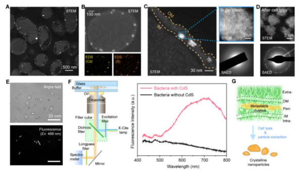 該團(tuán)隊(duì)通過(guò)在大腸桿菌周質(zhì)空間靶向合成半導(dǎo)體材料(納米光伏顆粒),將半導(dǎo)體材料吸收光能產(chǎn)生的電子高效轉(zhuǎn)化為細(xì)菌胞內(nèi)的生物能。具體來(lái)說(shuō),研究在通過(guò)大腸桿菌在胞內(nèi)利用半胱氨酸(Cys)合成H2S。因H2S具有極高的膜通透性(比水分子高3個(gè)數(shù)量級(jí)),可快速擴(kuò)散至周質(zhì)空間并與攝入到周質(zhì)空間的Cd2+反應(yīng),形成相應(yīng)的CdS納米顆粒外殼。 科研團(tuán)隊(duì)使用基于同步加速器的3D-X射線熒光光譜(3D X-ray fluorescence)和描透射電子顯微鏡?(STEM)確認(rèn)大腸菌成功合成CdS納米顆粒;制備材料-細(xì)菌雜合體的超薄切片,通過(guò)STEM分析發(fā)現(xiàn)CdS納米顆粒主要分布在周質(zhì)空間內(nèi)、大小約為29.3 nm、結(jié)晶度低;進(jìn)一步利用超聲破碎細(xì)胞、溶劑提取和分散細(xì)菌中的CdS納米顆粒,發(fā)現(xiàn)其大小僅為6 nm左右、結(jié)晶度提高,說(shuō)明周質(zhì)空間原位合成納米顆粒可能為多個(gè)CdS“納米團(tuán)簇“(nanoclusters)(約5個(gè))、結(jié)晶度降低,但賦予了生物雜合體熒光特性,而熒光成像和熒光光譜表明周質(zhì)空間合成的CdS納米團(tuán)簇是亞穩(wěn)態(tài)的,主要是無(wú)序和富含缺陷的聚集體。?