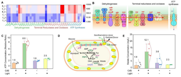 轉(zhuǎn)錄組顯示,在光照的條件下,周質(zhì)空間內(nèi)合成CdS的細(xì)菌雜合體與氧化呼吸鏈相關(guān)的基因(包括甲酸脫氫酶、NADH脫氫酶、甘油醛-3-磷酸脫氫酶、丙酮酸氧化酶、d -乳酸脫氫酶和葡萄糖脫氫酶)和ATP合成酶相關(guān)基因均顯著上調(diào),表明CdS吸收光能產(chǎn)生的電子加速了細(xì)菌氧化呼吸鏈電子傳遞速率,因此可能提高ATP的合成。為了驗(yàn)證這一推測(cè),研究人員對(duì)雜合體胞內(nèi)ATP濃度進(jìn)行分析發(fā)現(xiàn),雜合體在光照條件下比黑暗條件下的ATP高8.1倍,并應(yīng)用于提高ATP推動(dòng)的合成途徑的代謝通量。?