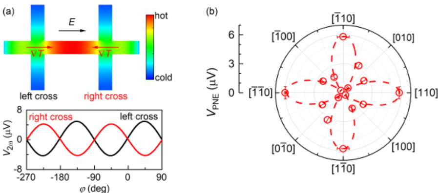 圖1. (a)雙十字霍爾器件中的平面能斯特效應(yīng);(b)CoFe (001)平面能斯特電壓的各向異性。