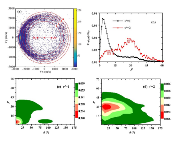 (a)產(chǎn)物N2+散射圖,(b)理論計(jì)算的N2+不同振動(dòng)能級的轉(zhuǎn)動(dòng)量子態(tài)分布以及N2+的v′ = 1(c)和v′ = 2(d)振動(dòng)能級的轉(zhuǎn)動(dòng)激發(fā)與散射角的相關(guān)性圖。