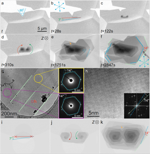 圖3.?石墨烯螺旋的再生長(zhǎng)和合并。(a-f)原位ESEM實(shí)驗(yàn)所記錄的褶皺出現(xiàn)到最終生長(zhǎng)成多層轉(zhuǎn)角石墨烯的全過(guò)程;(g)TEM表征下的多層轉(zhuǎn)角石墨烯;(h)原子分辨率的多層轉(zhuǎn)角石墨烯表征圖;(i-k)動(dòng)力學(xué)蒙特卡洛對(duì)該過(guò)程的模擬。