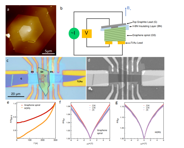 圖4.?多層螺旋石墨烯和多層堆垛石墨輸運(yùn)性質(zhì)的區(qū)別。(a)原子力顯微鏡觀察到的螺旋位錯(cuò)中心;(b-d)輸運(yùn)性質(zhì)檢測(cè)時(shí)的實(shí)驗(yàn)設(shè)置;(e-g)多層螺旋石墨烯和多層堆垛石墨的電阻和磁阻隨溫度變化的關(guān)系。