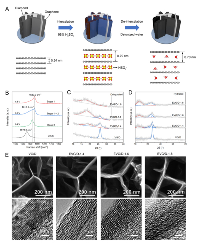 圖1.?層狀限域雙電層膨脹垂直石墨烯/金剛石薄膜電極的制備和表征:(A)制備流程示意圖;(B)石墨插層化合物的拉曼光譜;(C-D)XRD圖譜;(E)SEM和TEM圖像。