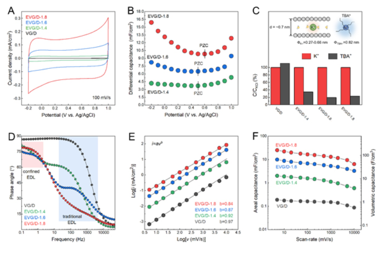 圖2.?層狀限域雙電層膨脹垂直石墨烯/金剛石薄膜電極的電化學(xué)行為:(A)CV曲線;(B)微分電容-電極電勢關(guān)系;(C)離子篩分效應(yīng);(D)EIS圖譜;(E-F)動力學(xué)分析。