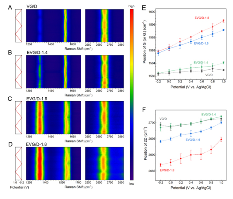 圖3.?層狀限域雙電層膨脹垂直石墨烯/金剛石薄膜電極的原位電化學(xué)拉曼光譜:(A-D)原位電化學(xué)拉曼光譜;(E-F)拉曼特征演變幅度分析。
