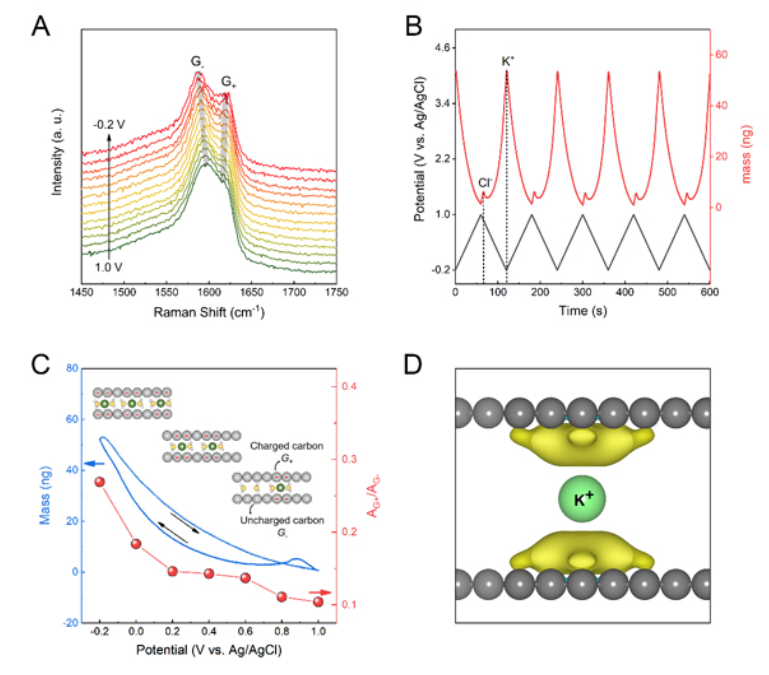 圖4.?層狀限域雙電層電容的儲能機(jī)理分析:(A)拉曼光譜中的體微天平分析;(C)電極質(zhì)量變化和拉曼特征變化的關(guān)聯(lián)性;(D)DFT-RISM計算獲得的圖像電荷分布。