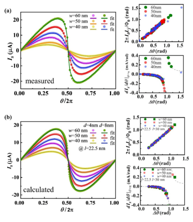 超導(dǎo)約瑟夫森結(jié)是構(gòu)成超導(dǎo)器件與電路的核心基礎(chǔ)單元,其電流相位關(guān)系(CPR)是決定器件性能的重要因素之一。長期以來,由于相位是一個(gè)不可測(cè)量的物理量,對(duì)于納米橋結(jié)的CPR缺乏準(zhǔn)確的描述,限制了納米橋結(jié)在超導(dǎo)器件與電路的實(shí)際應(yīng)用。為了實(shí)現(xiàn)超導(dǎo)約瑟夫森結(jié)CPR的精確測(cè)量與表征,研究團(tuán)隊(duì)基于自主開發(fā)的超導(dǎo)3D納米橋結(jié),設(shè)計(jì)并制備了用于測(cè)量CPR的超導(dǎo)約瑟夫森器件,實(shí)現(xiàn)了針對(duì)不同幾何參數(shù)的3D納米橋結(jié)CPR的精確測(cè)量,發(fā)現(xiàn)了橋結(jié)的CPR隨著結(jié)的幾何尺寸縮放的變化規(guī)律,并通過結(jié)合基于Ginzburg-Landau方程仿真結(jié)果的對(duì)比分析,獲取了其等效電學(xué)模型和關(guān)鍵電學(xué)參數(shù),為探索約瑟夫森結(jié)的CPR及其應(yīng)用奠定了重要的實(shí)驗(yàn)與理論基礎(chǔ)。
