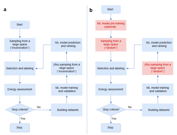 圖1.(a)用于有限尺寸化學(xué)無(wú)序材料結(jié)構(gòu)預(yù)測(cè)的流程圖,(b)用于準(zhǔn)無(wú)限尺寸化學(xué)無(wú)序材料結(jié)構(gòu)預(yù)測(cè)的流程圖
