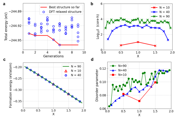 圖2. (a) “辣搜”方法在Mg3Bi2-xSbx(x=0.5,N=90)體系搜索過(guò)程中總能量隨搜索代數(shù)的演化;(b) 三種不同尺寸(N = 10、40和90)的搜索過(guò)程中第一性原理計(jì)算所需的時(shí)間;(c) 三種不同尺寸(N = 10、40和90)下Mg3Bi2-xSbx(0<x<2)的形成能曲線;(d)三種不同尺寸(N = 10、40 和 90)下Mg3Bi2-xSbx(0<x<2)的無(wú)序參數(shù)曲線。