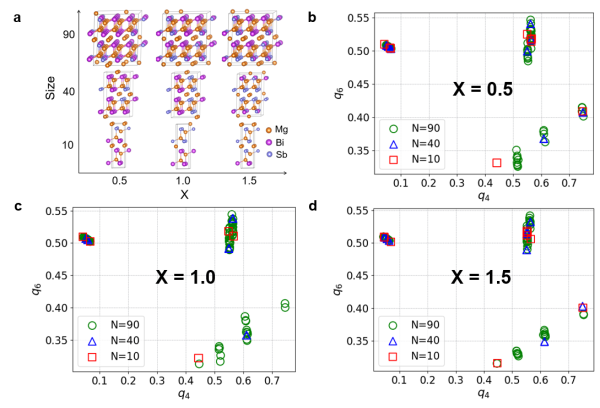 圖3. (a)三種不同尺寸(N=10、40和90)在 x=0.5、1.0和1.5下預(yù)測(cè)的晶體結(jié)構(gòu);(b)在x=0.5時(shí)三種不同尺寸(N=10、40和90)預(yù)測(cè)的晶體結(jié)構(gòu)q4和q6分布;(c)在x=1.0時(shí)三種不同尺寸(N=10、40和90)預(yù)測(cè)的晶體結(jié)構(gòu)q4和q6分布;(d)x=1.5時(shí)三種不同尺寸(N=10、40和90)預(yù)測(cè)的晶體結(jié)構(gòu)q4和q6分布。