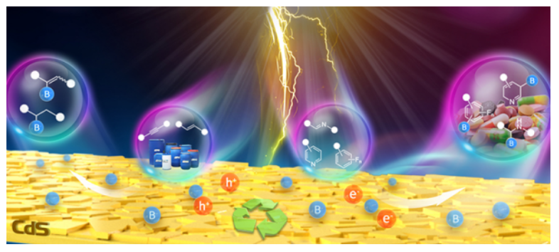 近日,中國科學院大連化學物理研究所精細化工研究室有機硼化學與綠色氧化創新特區研究組研究員戴文團隊,在多相光催化硼化方面取得新進展。該團隊選用易于制備的硫化鎘納米片作為多相光催化劑,利用光生電子—空穴的協同氧化還原作用,通過選擇性硼化反應,實現了烯烴、炔烴、亞胺以及芳(雜)環的高值轉化,合成了硼氫化和硼取代產物。